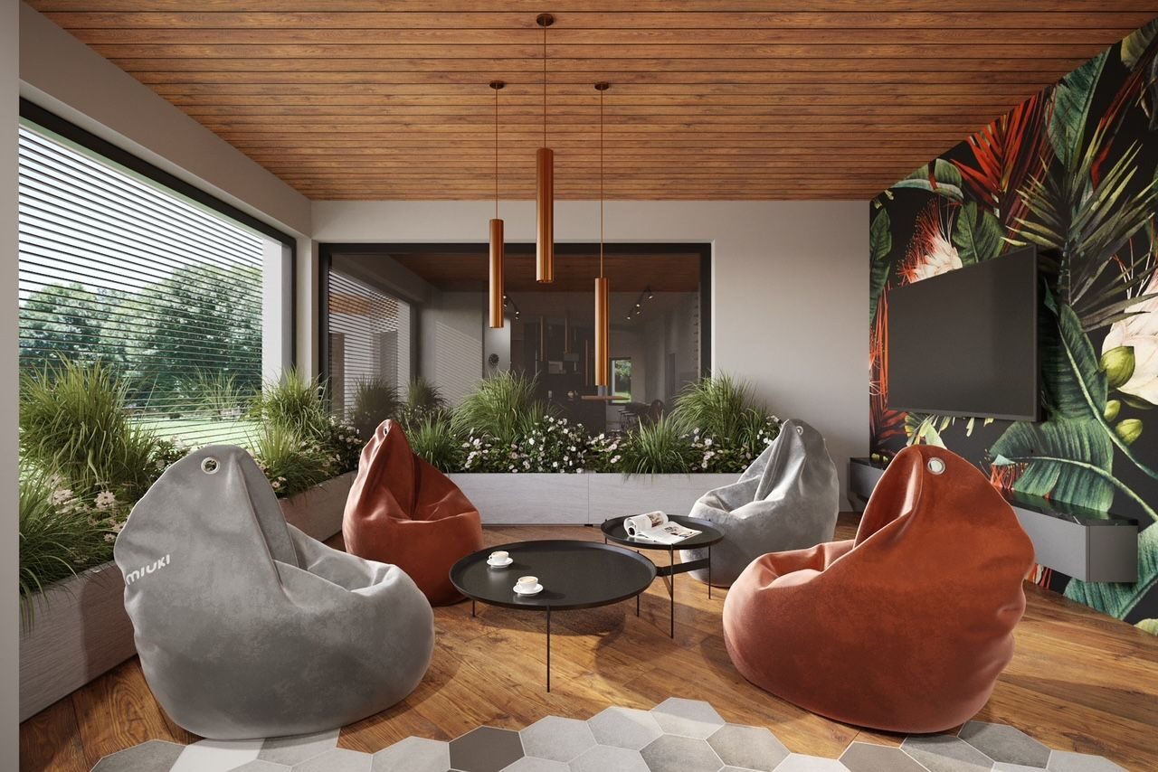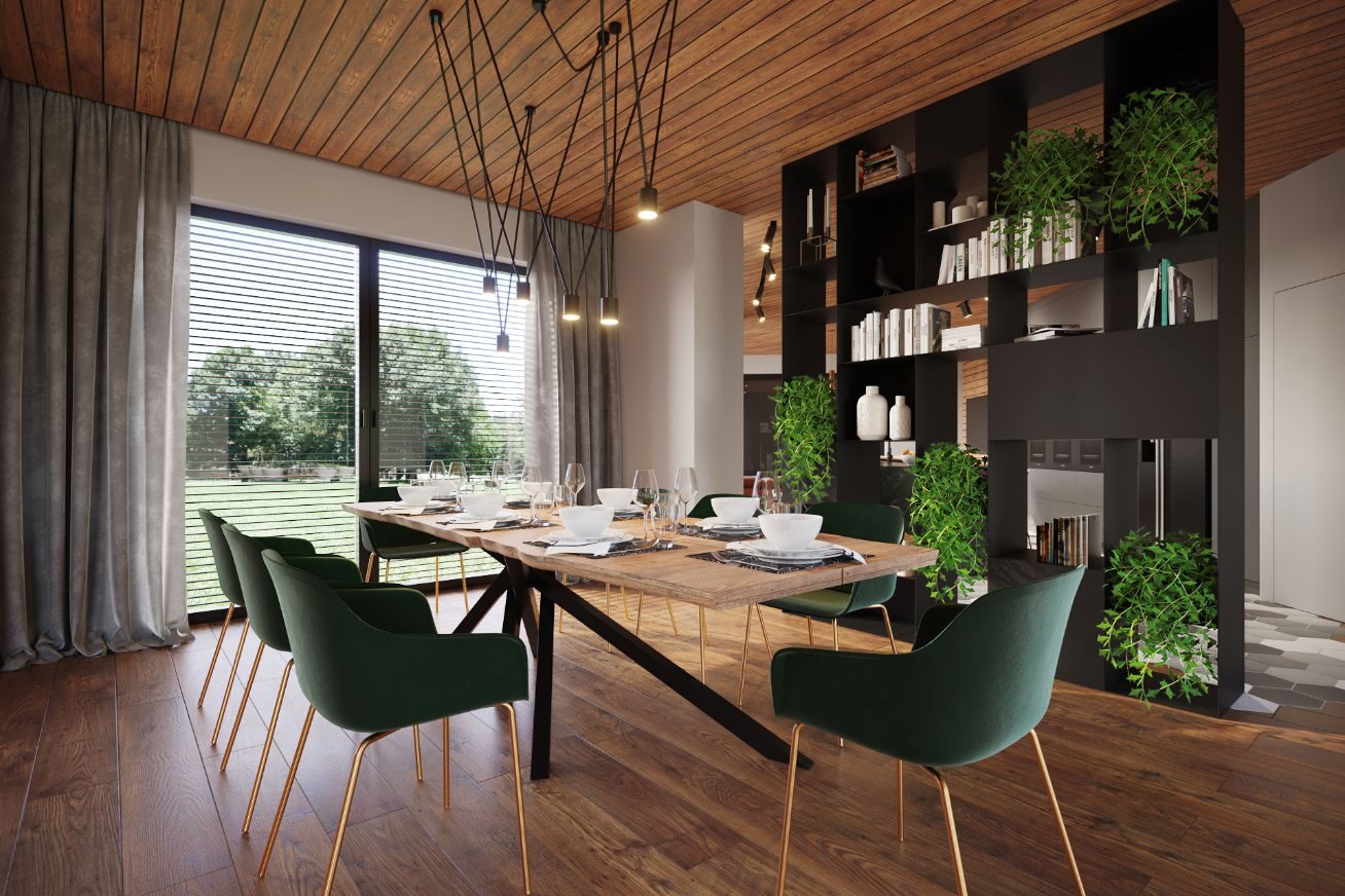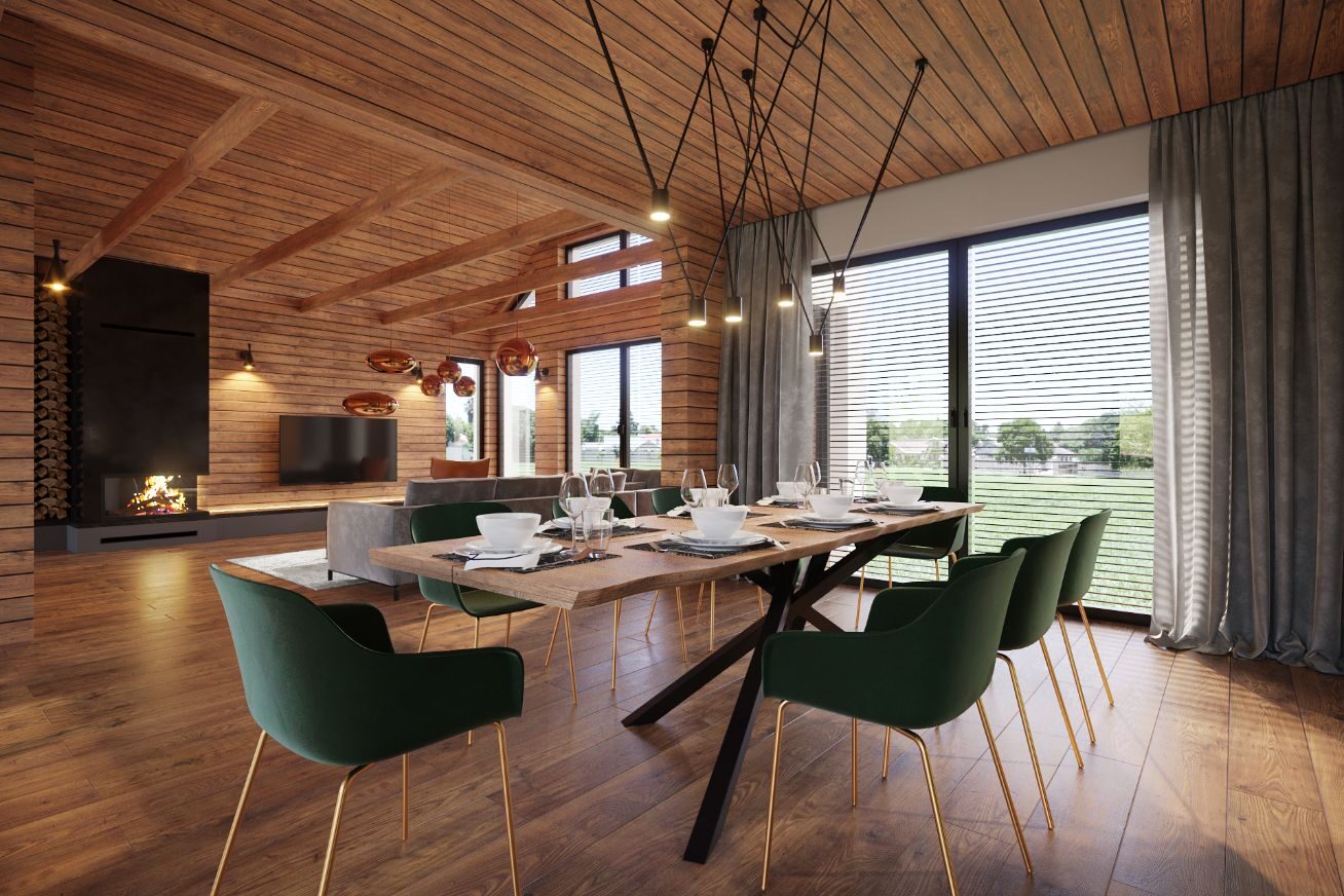A 200 m2 space spruced up with natural wood planking and modern design elements. The living room and dining room is distinguished by its elegant design, which is dominated by natural materials and warm colors.
