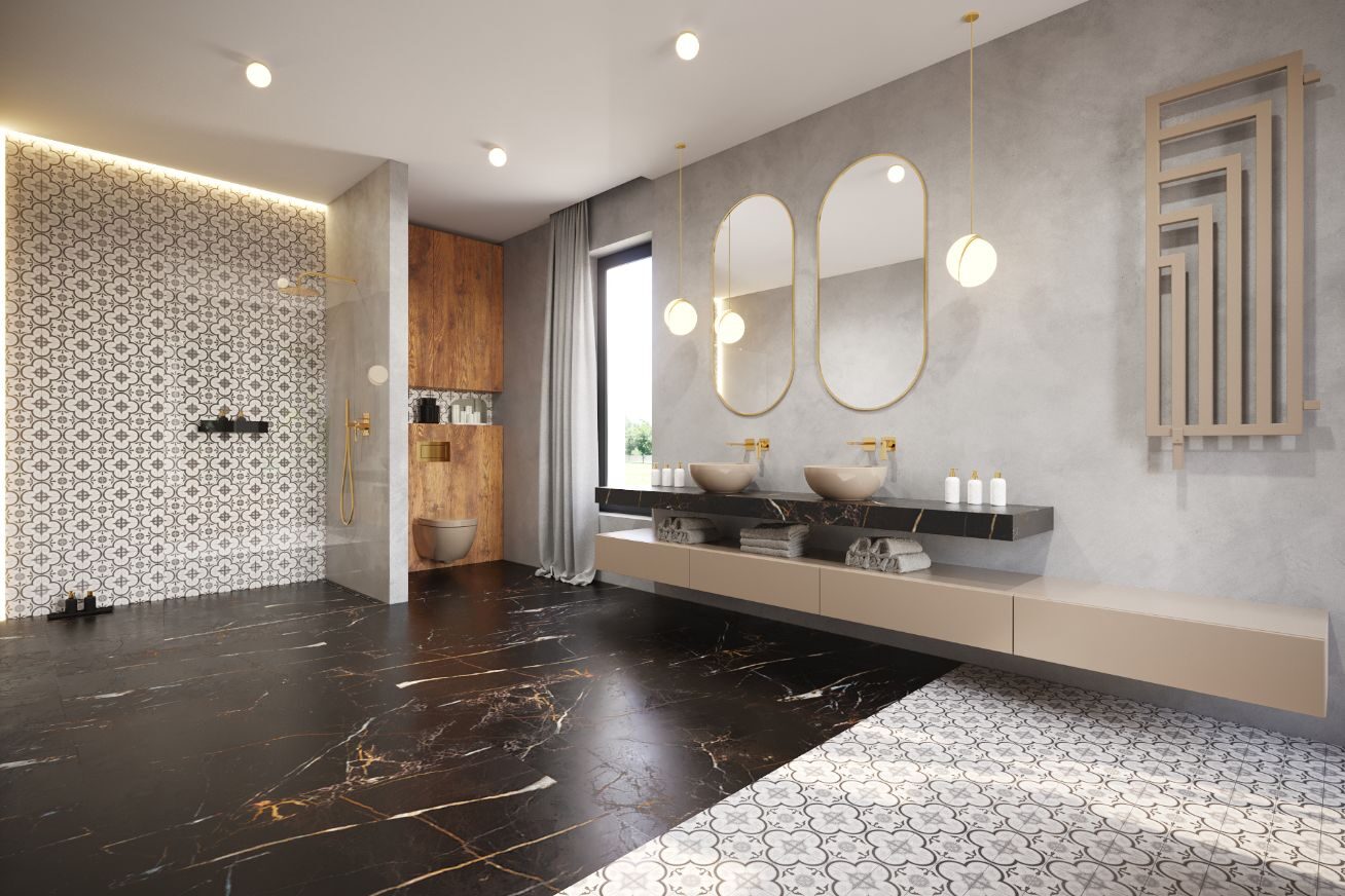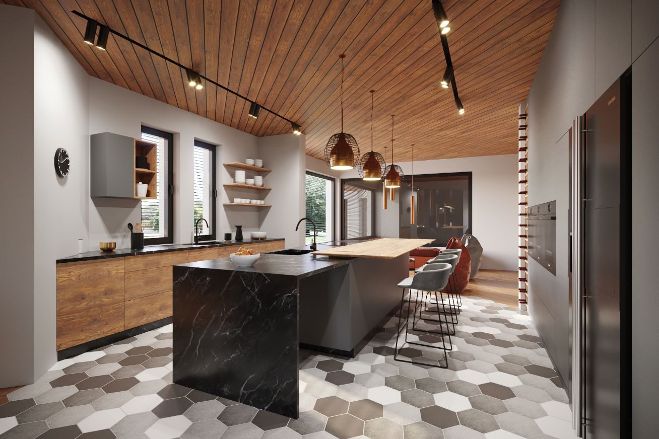 The kitchen, with a sleek, minimalist design, combines the warmth of wood with elegant dark accents. The centerpiece is a kitchen island with a marble countertop, surrounded by stylish pendant lamps, and the whole is complemented by a geometric floor of hexagonal tiles.