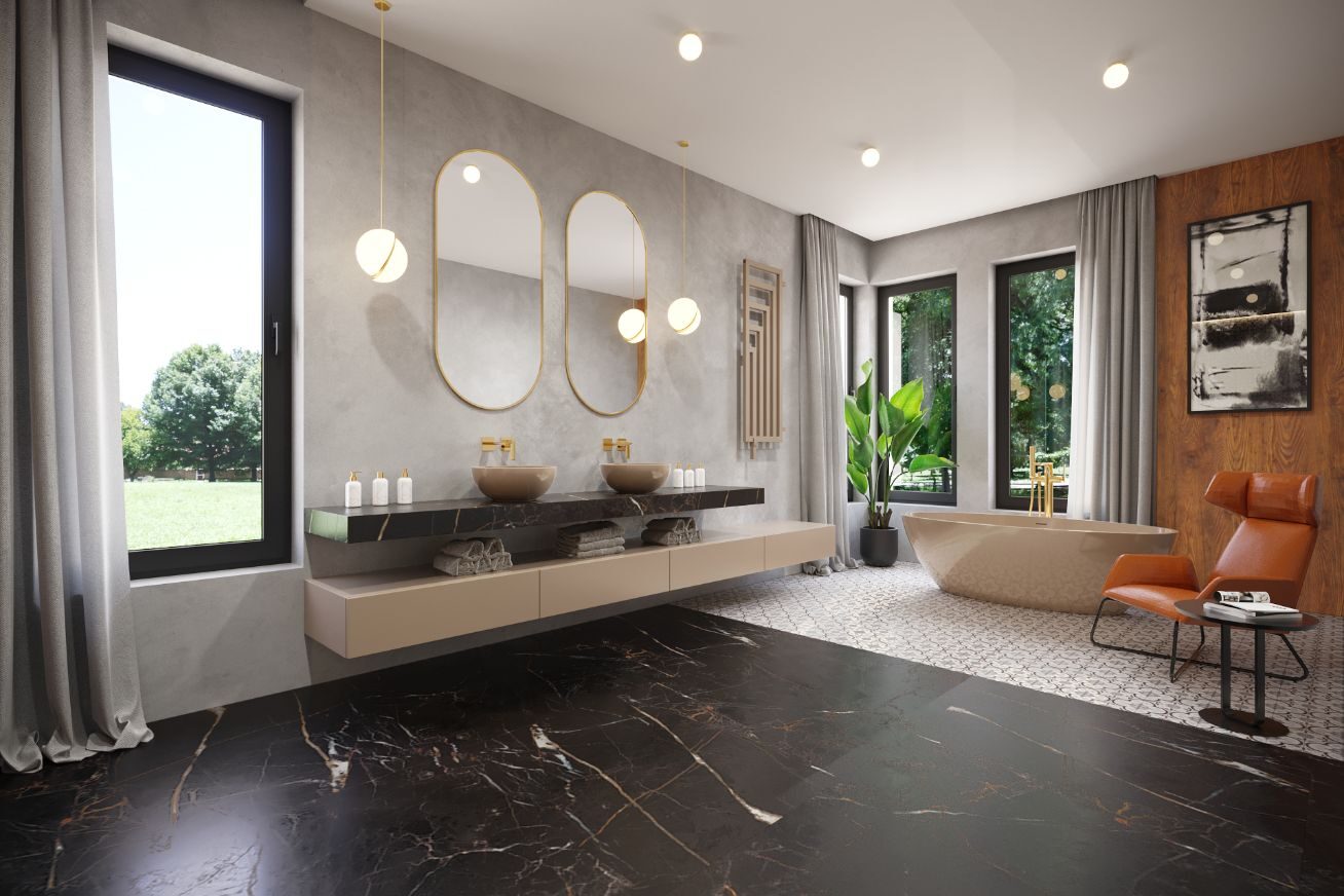 Bathroom combines elegance and functionality with a marble floor, golden accents, and designer lighting. Large windows fill the space with natural light, while a freestanding bathtub and cozy chair add comfort.