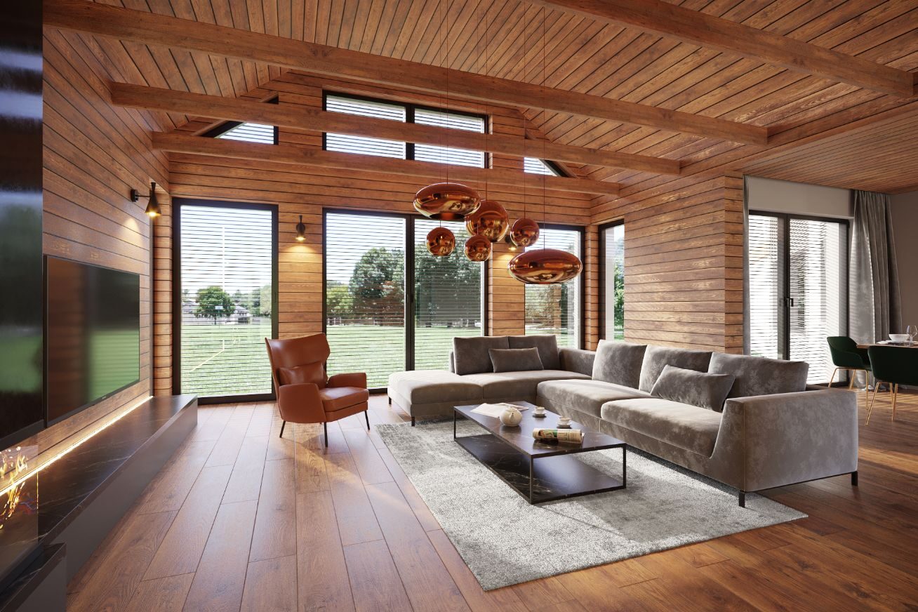 This modern living room blends exposed wooden blends, large windows, and an elegant fireplace. A grey sectional sofa takes center stage, complemented by designer pendant lights and minimalist accents.